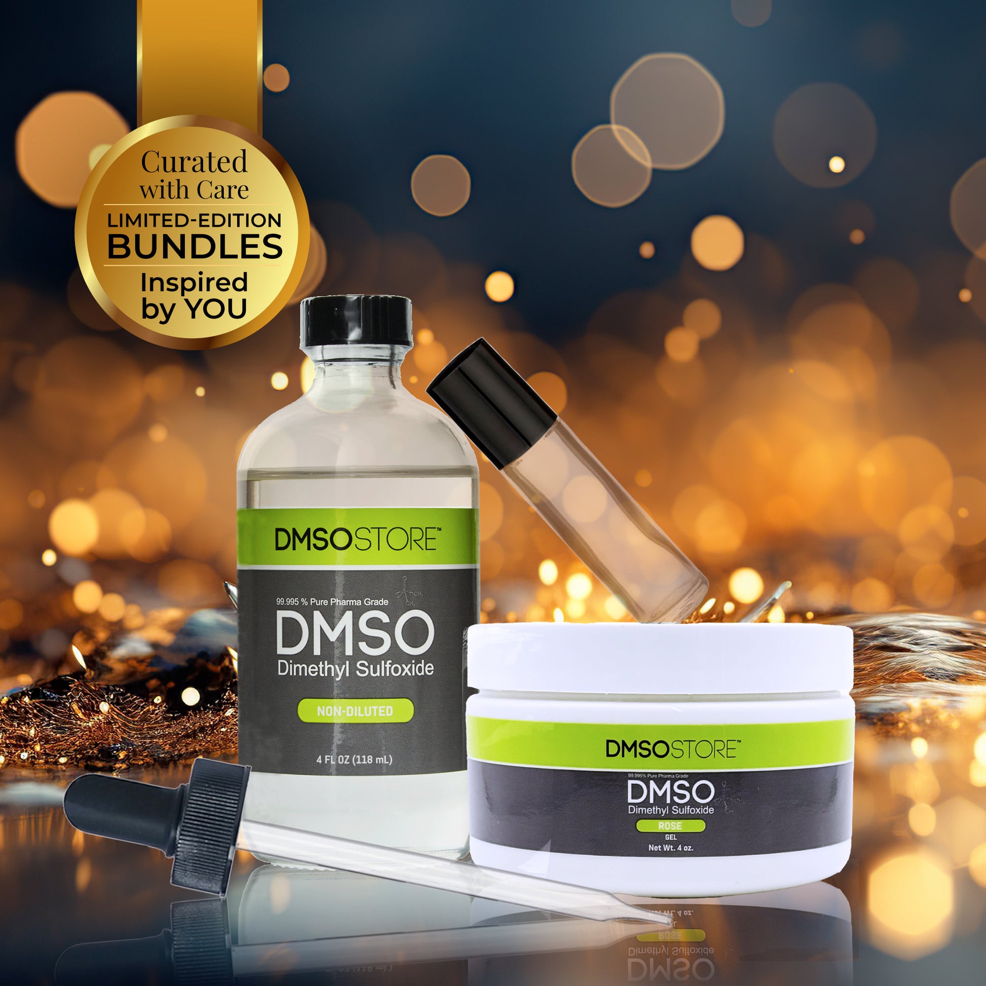 Pure meets petal. Undiluted DMSO liquid and a rose-scented gel come together for balanced relief and a touch of natural elegance. Includes refillable accessories for easy use and travel.