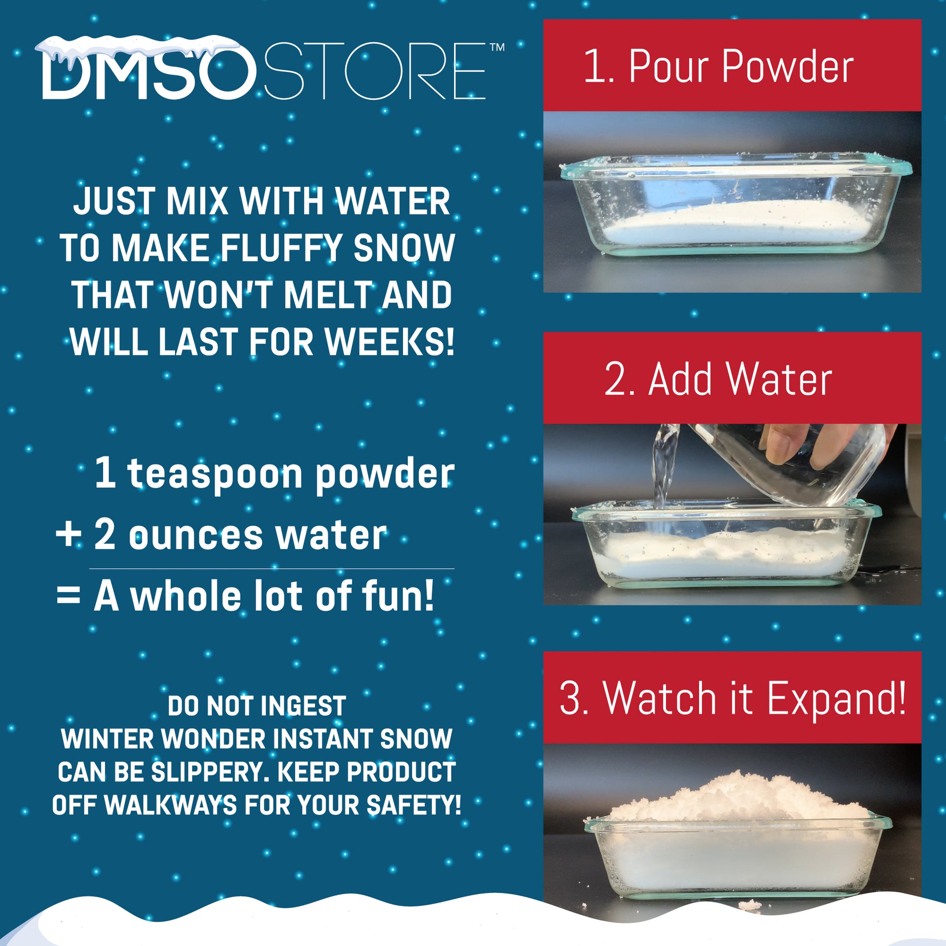 Just add water to make fluffy snow that won't melt and will last for weeks!